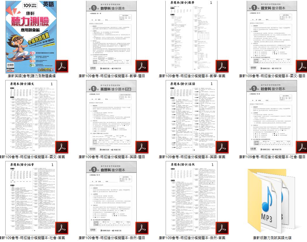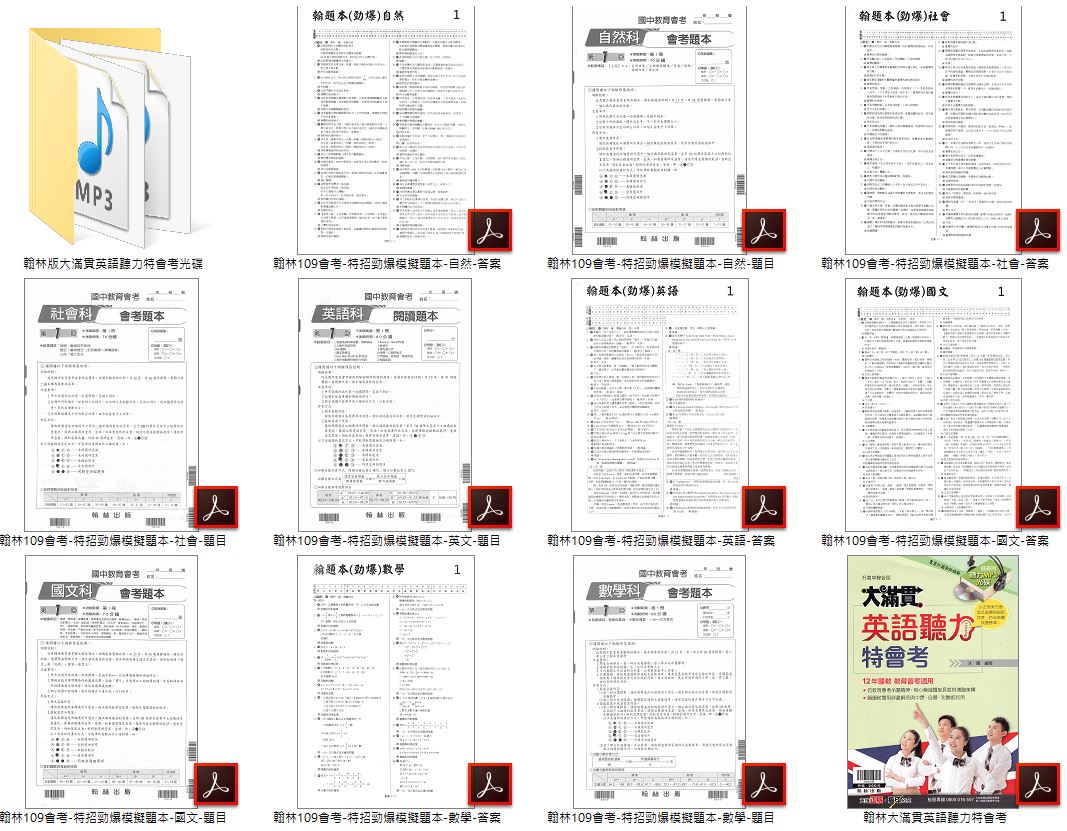 109年 國中會考 全科目 康軒特招搶分模擬題本+翰林特招勁爆模擬題本+南一特招縱橫模擬題本+英語聽力測驗進階篇+翰林大滿貫英語聽力特會考+康軒英語聽力測驗題彙編(含康軒+翰林英語MP3) 會考題庫DVD版